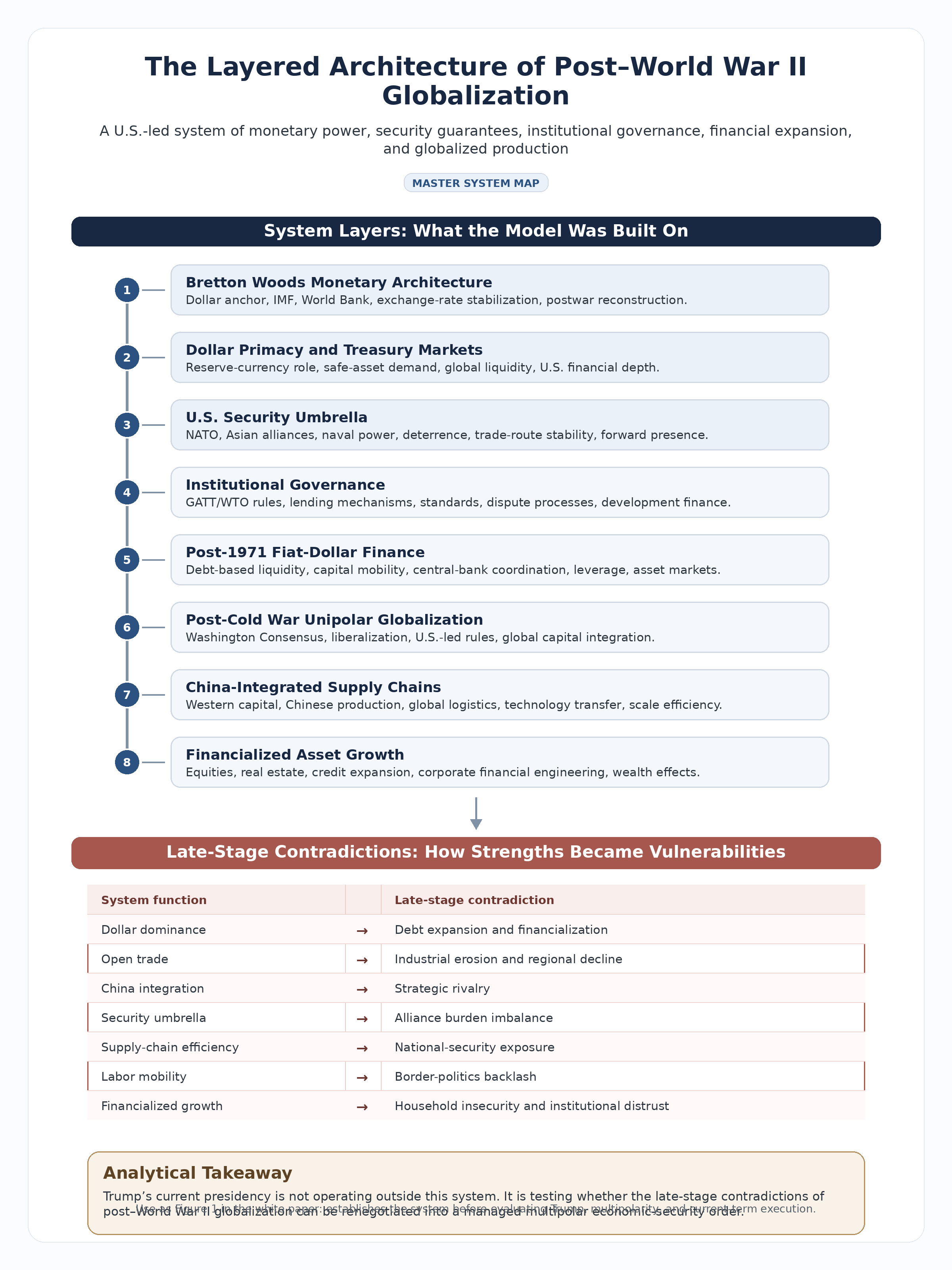 Trump’s presidency should therefore be assessed not against “globalization” in the abstract, but against this specific historical model: post–World War II globalization as organized around U.S. monetary power, U.S. security guarantees, open trade, financial integration, China-linked supply chains, and post-Cold War unipolarity.